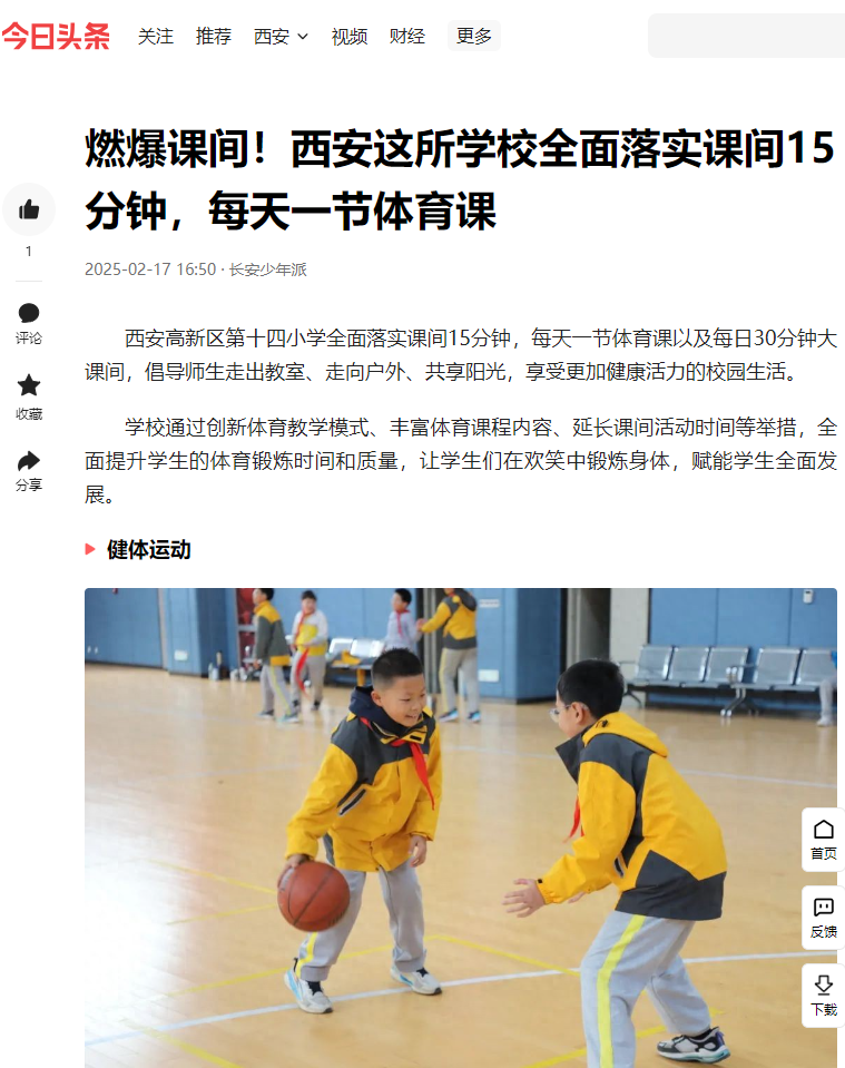 西安高新区第十四小学全面落实课间15分钟,每天一节体育课以及每日30分钟大课间,倡导师生走出教室、走向户外、共享阳光,享受更加健康活力的校园生活。